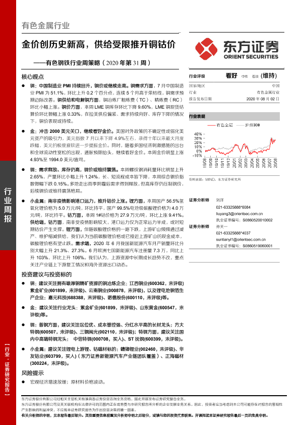 【东方证券】【20200802】20200802-东方证券-有色钢铁行业周策略(2020年第31周):金价创历史新高,供给受限推升铜钴价-26页