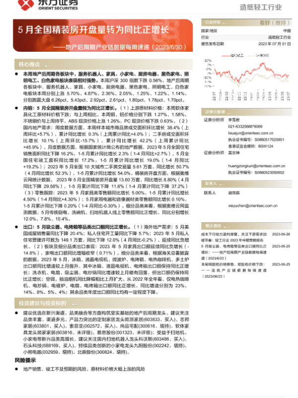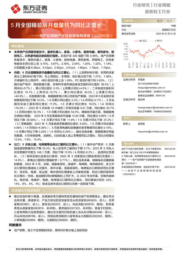 【东方证券】【20230701】地产后周期产业链数据每周速递:5月全国精装房开盘量转为同比正增长-15页