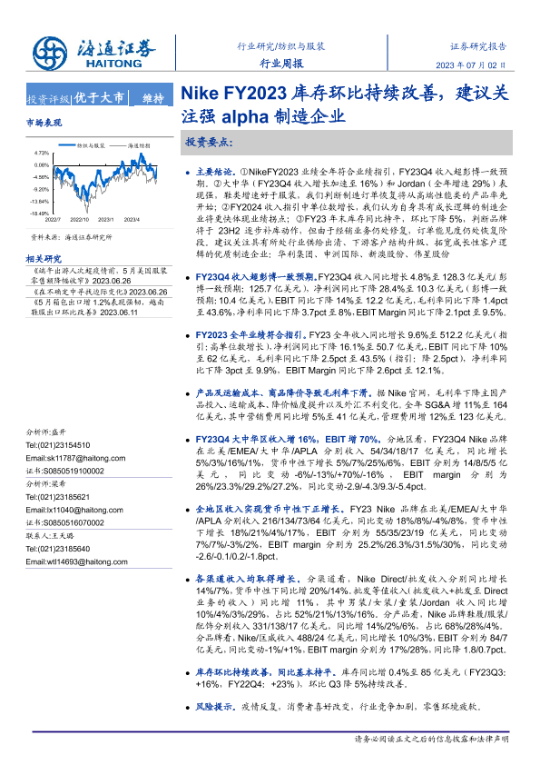 【海通证券】【20230702】20230702-海通证券-纺织与服装行业周报:Nike FY2023库存环比持续改善,建议关注强alpha制造企业-11页