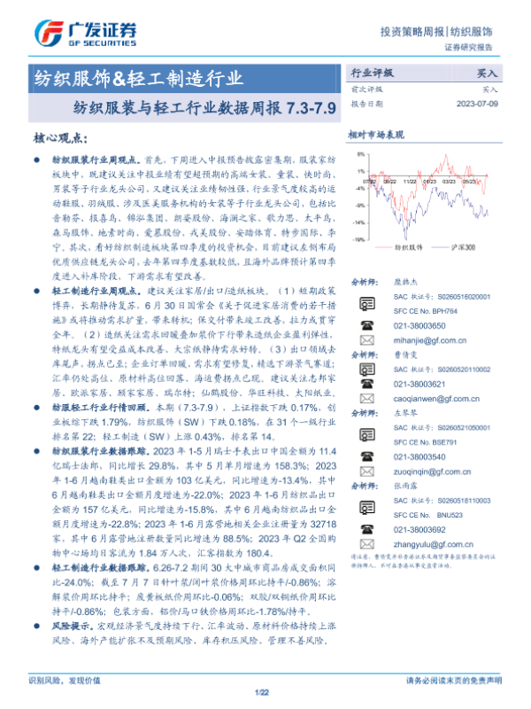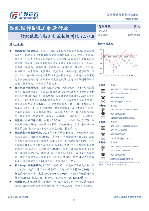 【广发证券】【20230709】20230709-广发证券-纺织服饰&轻工制造行业投资策略周报:纺织服装与轻工行业数据周报7.3-7.9-22页