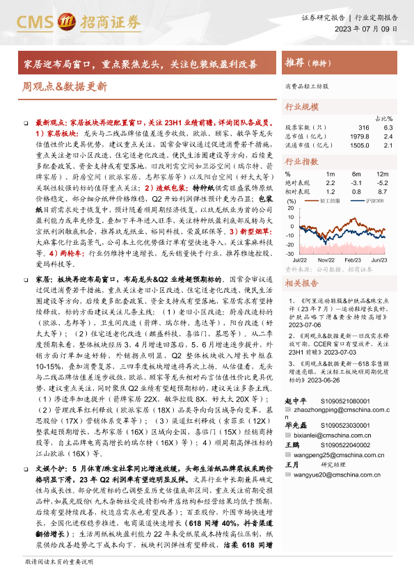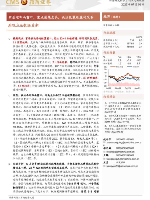 【海通证券】【20230709】20230709-招商证券-消费品轻工纺服行业周观点&数据更新:家居迎布局窗口,重点聚焦龙头,关注包装纸盈利改善-28页