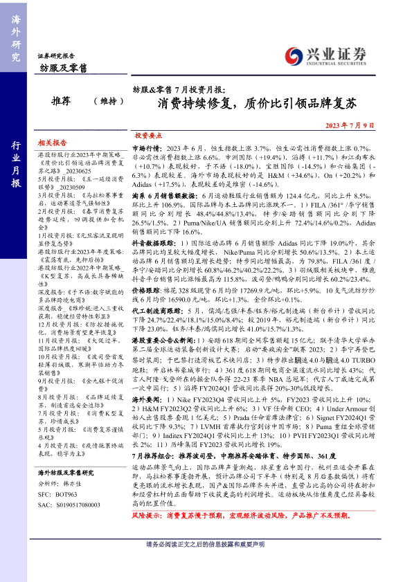 【兴业证券】【20230709】纺服&零售 7月投资月报:消费持续修复,质价比引领品牌复苏-27页