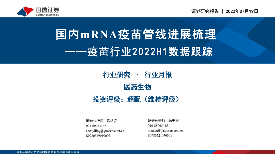 2022上半年 mRNA疫苗 医药生物 国信证券 国内进展