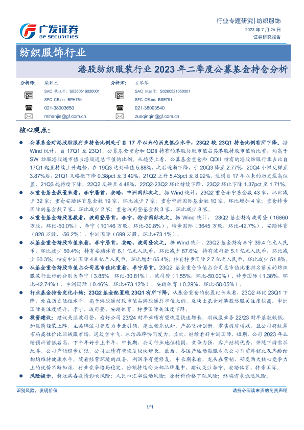 【广发证券】【20230726】港股纺织服装行业2023年二季度公募基金持仓分析-11页