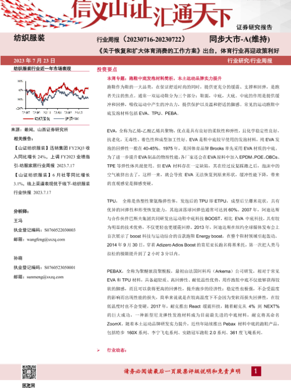 体育消费 市场表现 政策利好 纺织服装 跑鞋中底材料