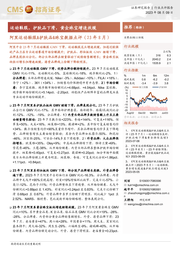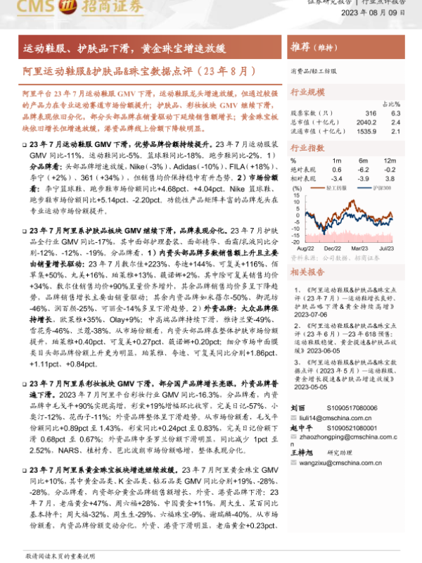 【海通证券】【20230809】阿里运动鞋服&护肤品&珠宝数据点评(23年8月):运动鞋服、护肤品下滑,黄金珠宝增速放缓-16页