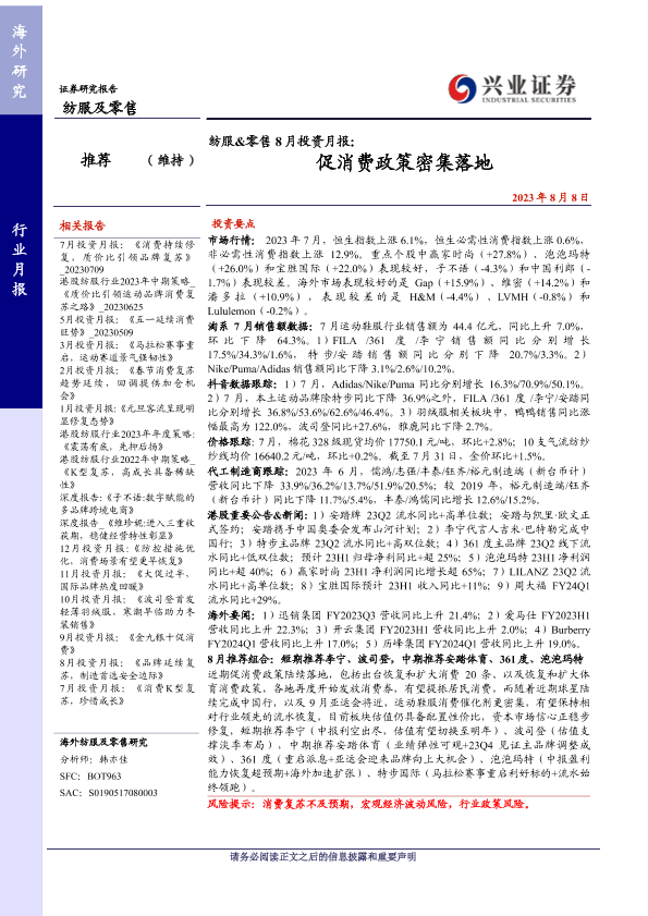 【兴业证券】【20230808】20230808-兴证国际证券-纺服&零售行8月投资月报:促消费政策密集落地-27页