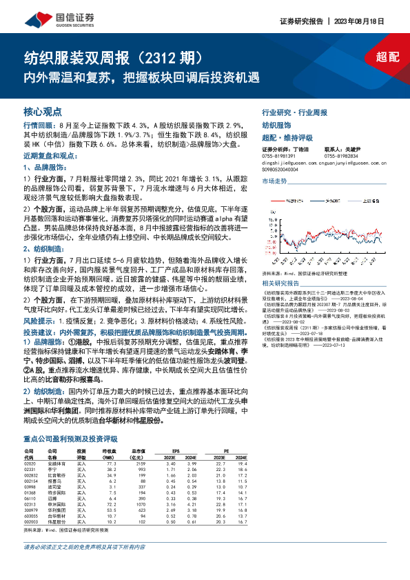 【国信证券】【20230818】20230818-国信证券-纺织服装双周报(2312期):内外需温和复苏,把握板块回调后投资机遇-13页