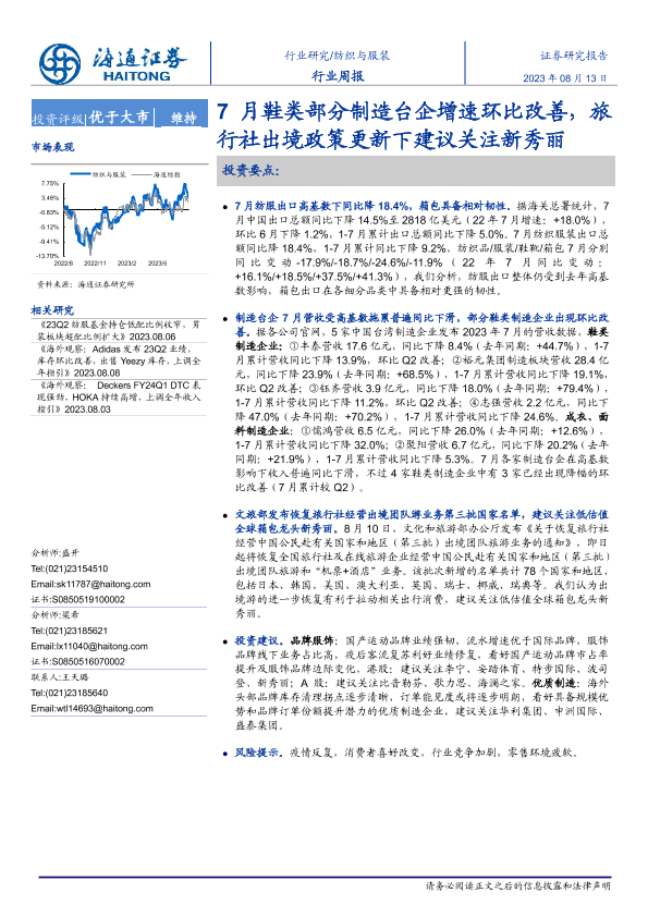 【海通证券】【20230813】20230813-海通证券-纺织与服装行业周报:7月鞋类部分制造台企增速环比改善,旅行社出境政策更新下建议关注新秀丽-11页