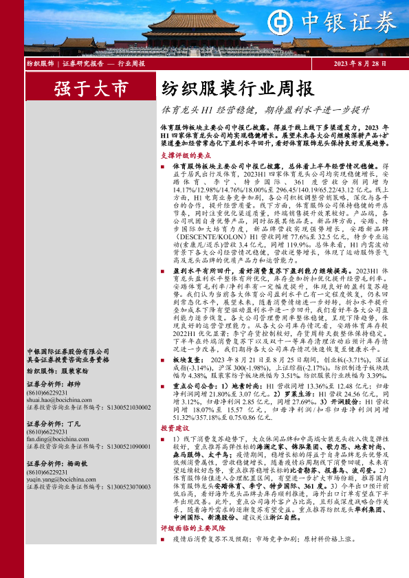 【中银证券】【20230828】20230828-中银证券-纺织服装行业周报:体育龙头H1经营稳健,期待盈利水平进一步提升-20页