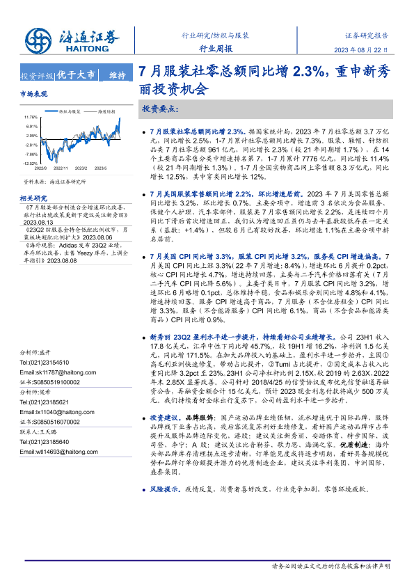 【海通证券】【20230822】20230822-海通证券-纺织与服装行业周报:7月服装社零总额同比增2.3%,重申新秀丽投资机会-11页