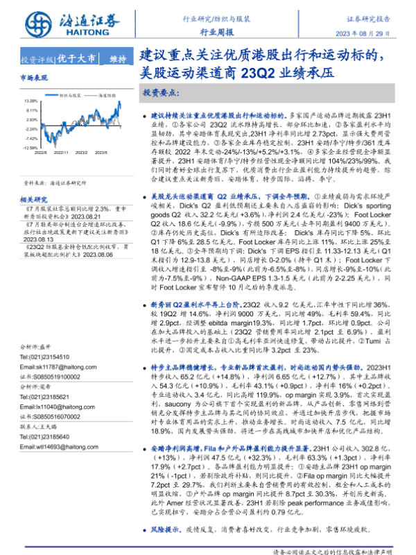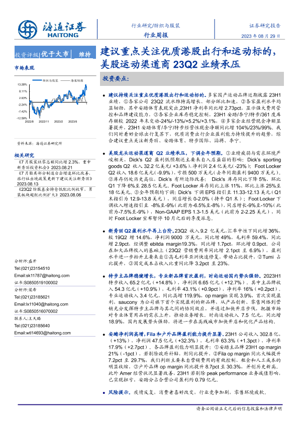 【海通证券】【20230829】20230829-海通证券-纺织与服装行业周报:建议重点关注优质港股出行和运动标的,美股运动渠道商23Q2业绩承压-10页