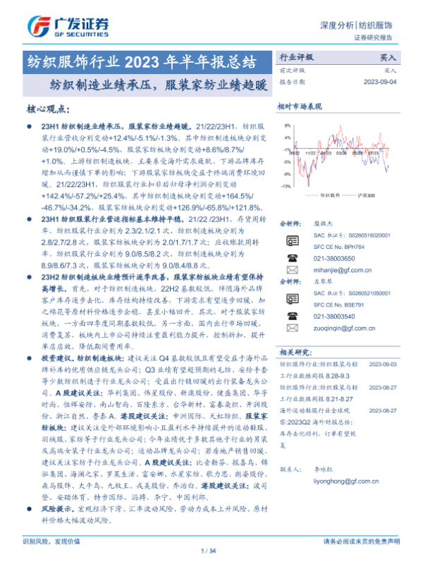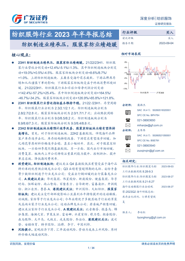 【广发证券】【20230904】纺织服饰行业2023年半年报总结:纺织制造业绩承压,服装家纺业绩趋暖-34页