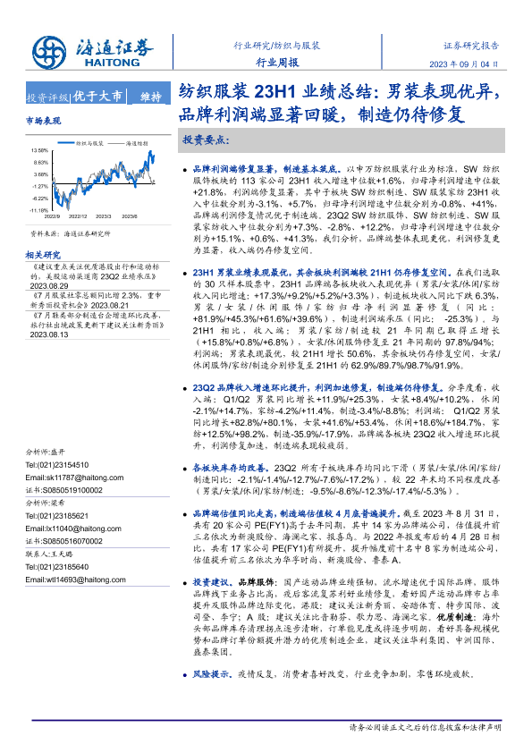 【海通证券】【20230904】20230904-海通证券-纺织服装23H1业绩总结:男装表现优异,品牌利润端显著回暖,制造仍待修复-11页