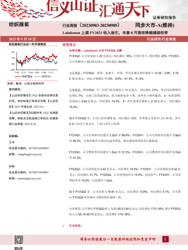 【山西证券】【20230910】纺织服装行业周报:Lululemon上调FY2023收入指引,丰泰8月营收降幅继续收窄-24页