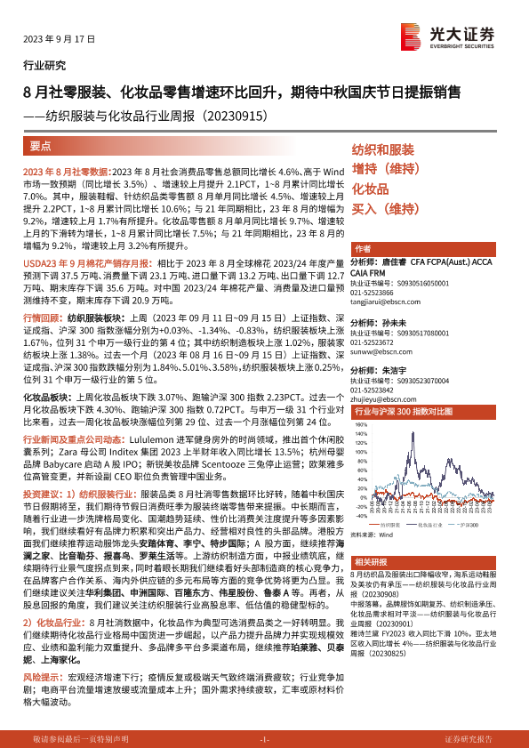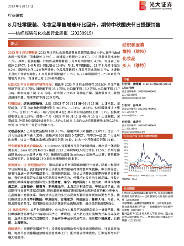 【光大证券】【20230917】20230917-光大证券-纺织服装与化妆品行业周报:8月社零服装、化妆品零售增速环比回升,期待中秋国庆节日提振销售-11页