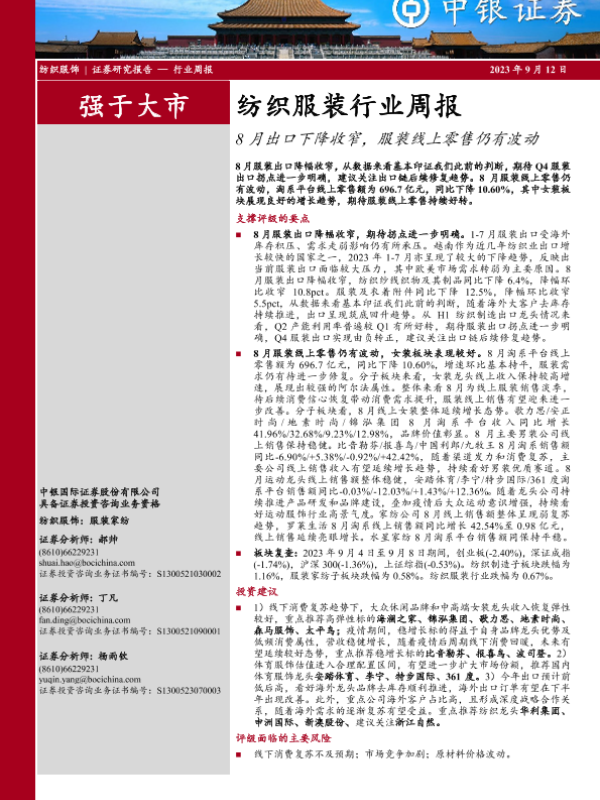 【中银证券】【20230912】20230912-中银证券-纺织服装行业周报:8月出口下降收窄,服装线上零售仍有波动-24页
