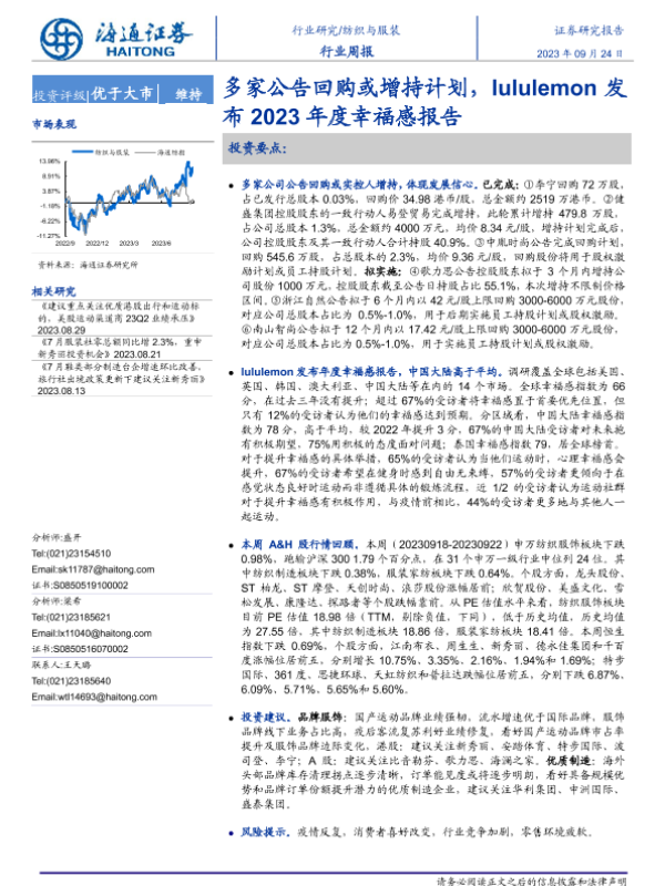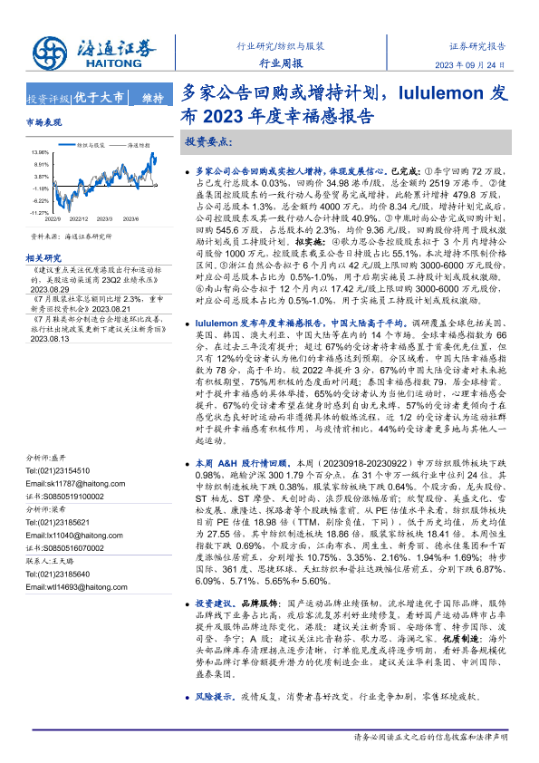 【海通证券】【20230924】20230924-海通证券-纺织与服装行业周报:多家公告回购或增持计划,lululemon发布2023年度幸福感报告-11页