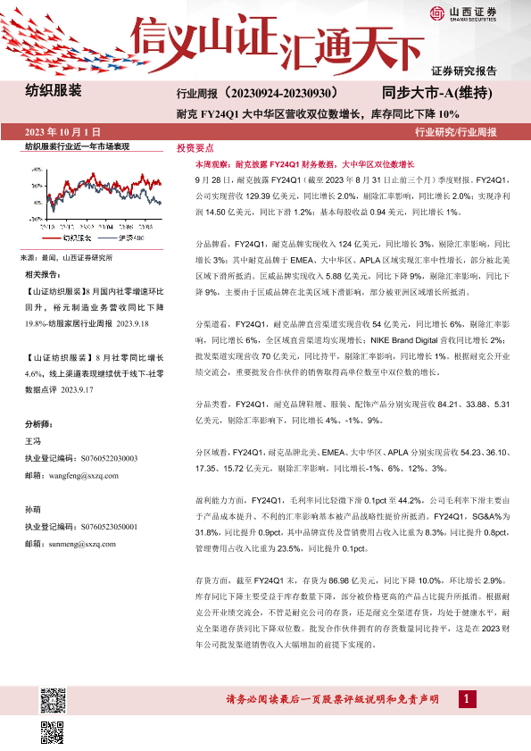 【山西证券】【20231001】纺织服装行业周报:耐克FY24Q1大中华区营收双位数增长,库存同比下降10%-25页