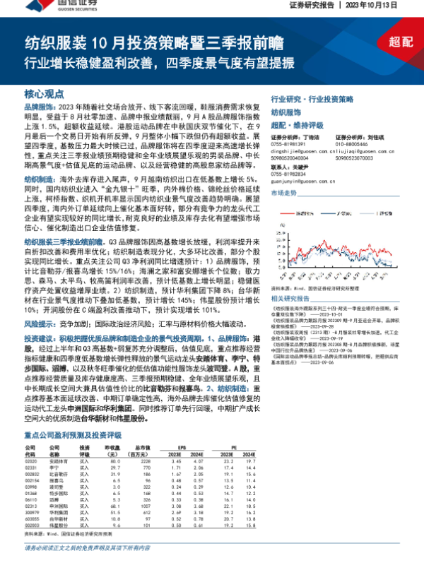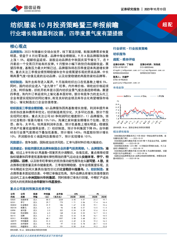 【国信证券】【20231013】20231013-国信证券-纺织服装10月投资策略暨三季报前瞻:行业增长稳健盈利改善,四季度景气度有望提振-26页