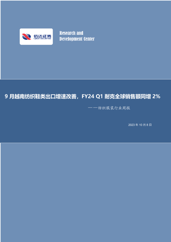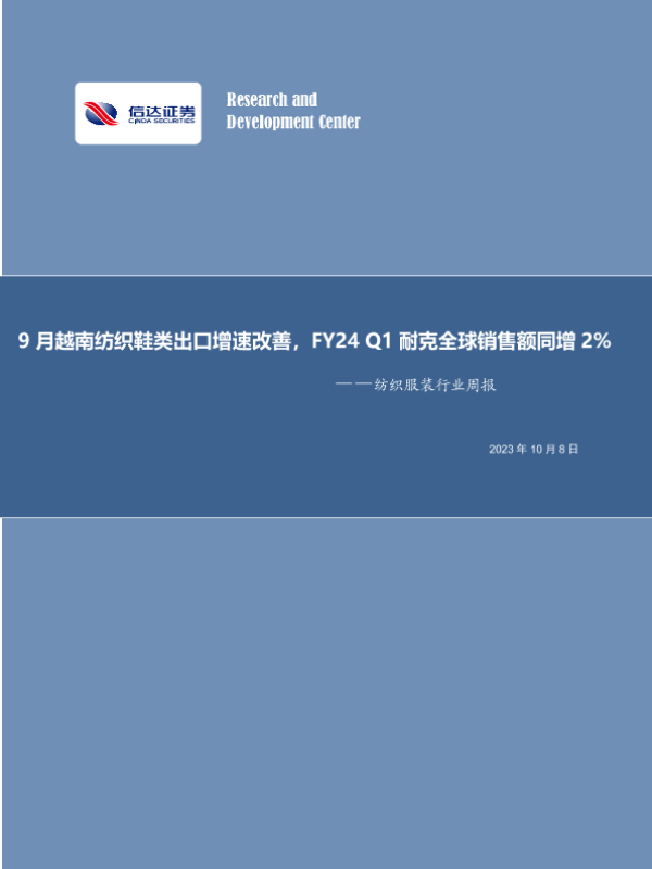 【信达证券】【20231008】20231008-信达证券-纺织服装行业周报:9月越南纺织鞋类出口增速改善,FY24Q1耐克全球销售额同增2%-14页
