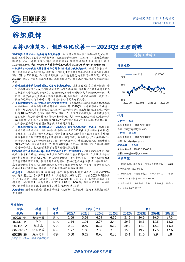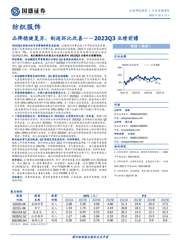 【国盛证券】【20231013】纺织服饰2023Q3业绩前瞻:品牌稳健复苏,制造环比改善-12页