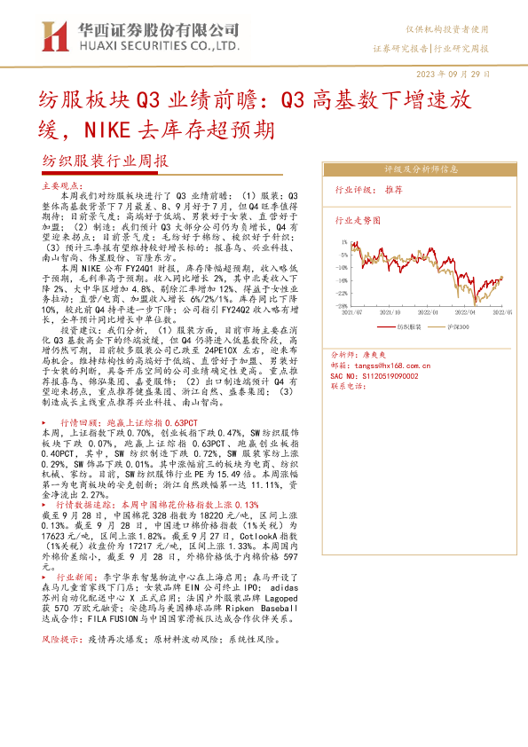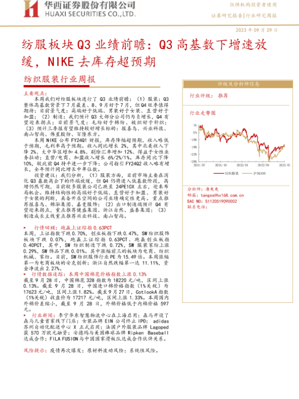 【华西证券】【20230929】20230929-华西证券-纺织服装行业周报:纺服板块Q3业绩前瞻:Q3高基数下增速放缓,NIKE去库存超预期-29页
