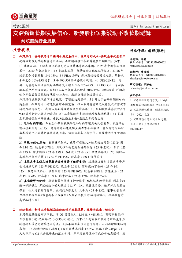 【浙商证券】【20231022】20231022-浙商证券-纺织服装行业周报:安踏强调长期发展信心,新澳股份短期波动不改长期逻辑-14页