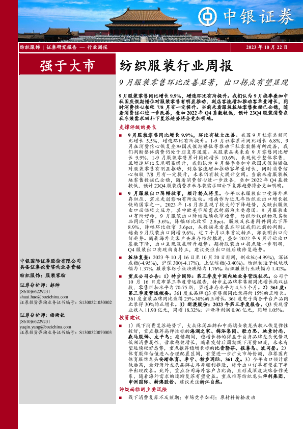 【中银证券】【20231022】20231022-中银证券-纺织服装行业周报:9月服装零售环比改善显著,出口拐点有望显现-19页