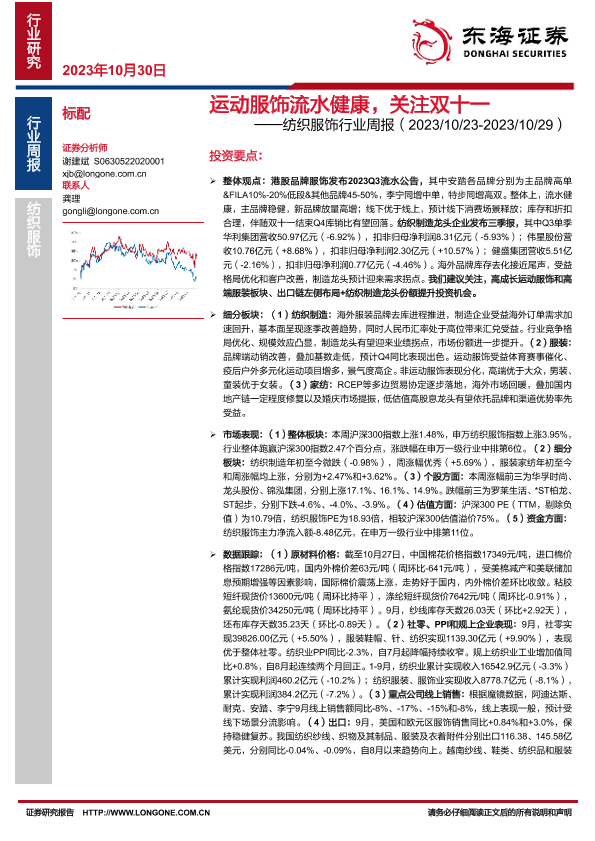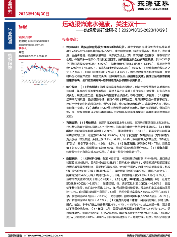 【东海证券】【20231030】20231030-东海证券-纺织服饰行业周报:运动服饰流水稳健,关注双十一-12页