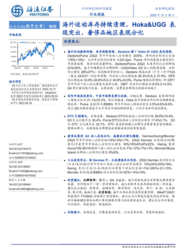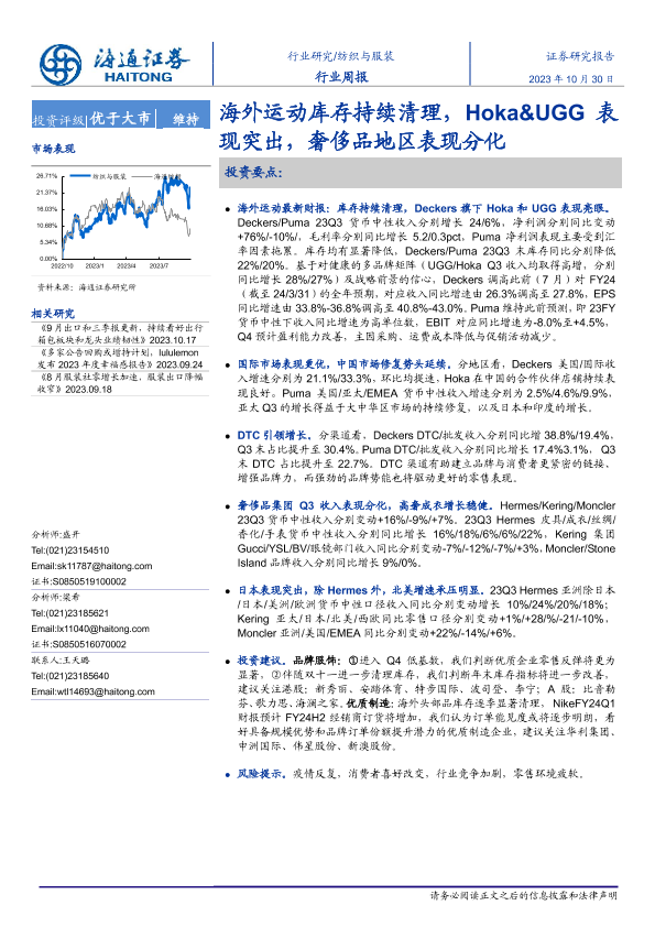 【海通证券】【20231030】20231030-海通证券-纺织与服装行业周报:海外运动库存持续清理,Hoka&UGG表现突出,奢侈品地区表现分化-10页