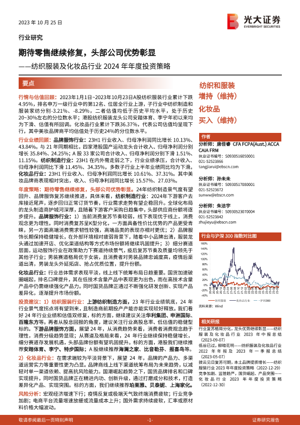 【光大证券】【20231025】纺织服装及化妆品行业2024年年度投资策略:期待零售继续修复,头部公司优势彰显-46页