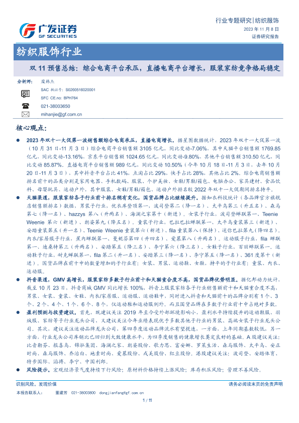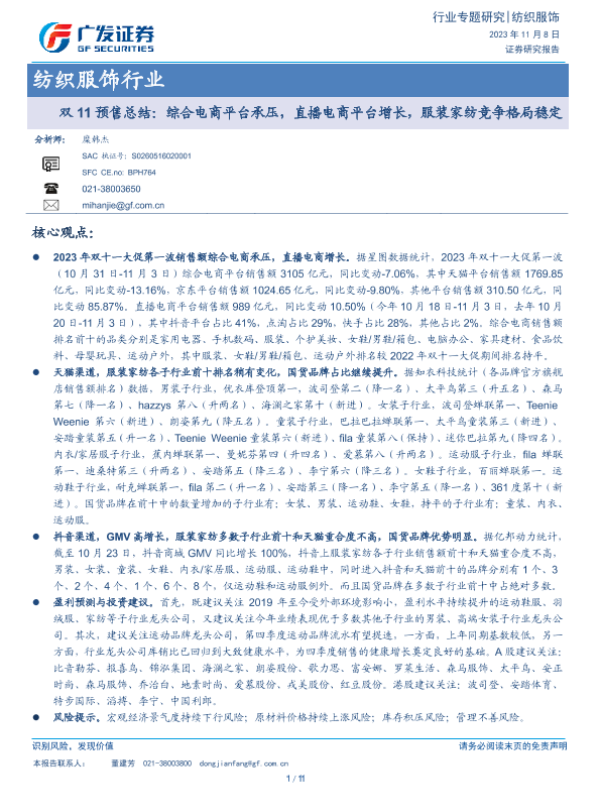 【广发证券】【20231108】20231108-广发证券-纺织服饰行业双11预售总结:综合电商平台承压,直播电商平台增长,服装家纺竞争格局稳定-11页