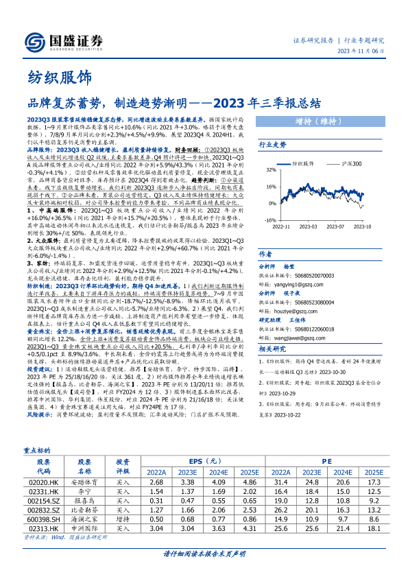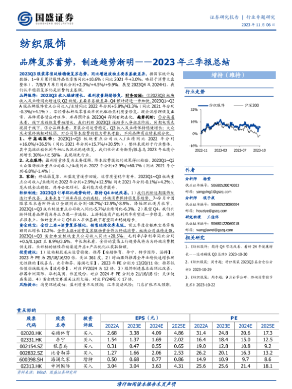 【国盛证券】【20231106】纺织服饰2023年三季报总结:品牌复苏蓄势,制造趋势渐明-25页