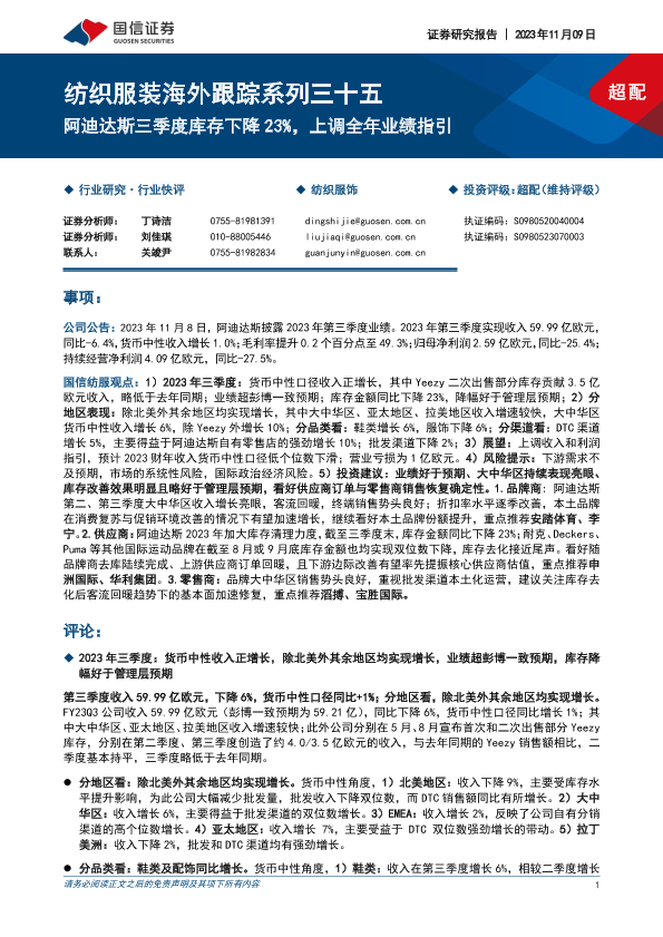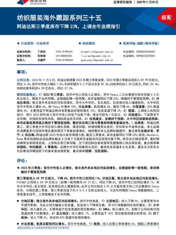【国信证券】【20231109】纺织服装海外跟踪系列三十五:阿迪达斯三季度库存下降23%,上调全年业绩指引-10页