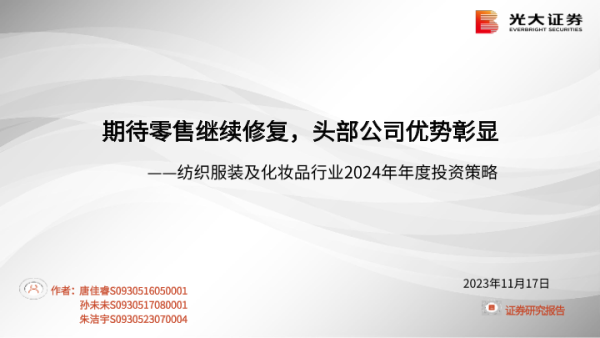 【光大证券】【20231117】纺织服装及化妆品行业2024年年度投资策略:期待零售继续修复,头部公司优势彰显-53页