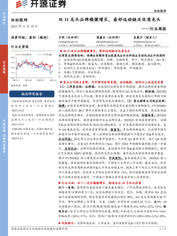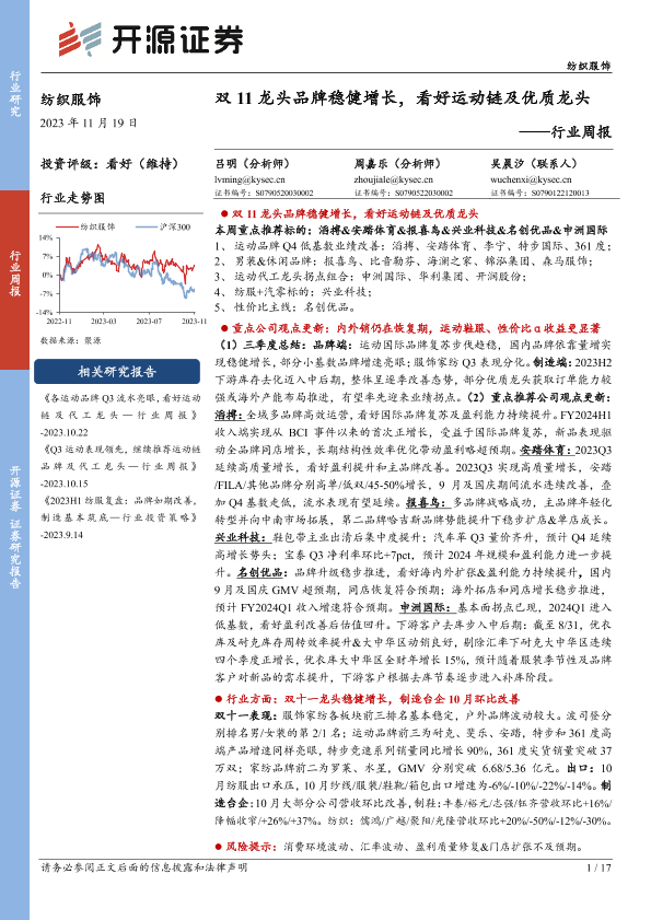【开源证券】【20231119】20231119-开源证券-纺织服饰行业周报:双11龙头品牌稳健增长,看好运动链及优质龙头-17页