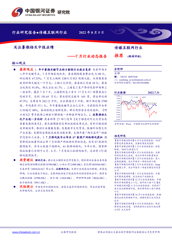 【银河证券】【20220805】7月传媒互联网行业动态报告:关注暑期档及中报业绩-20页