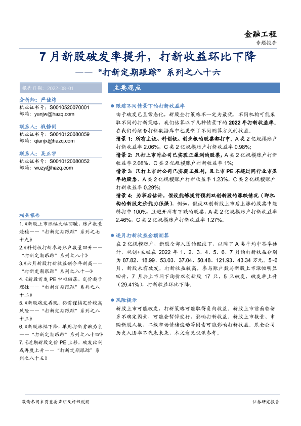 【华安证券】【20220801】“打新定期跟踪”系列之八十六:7月新股破发率提升,打新收益环比下降-22页
