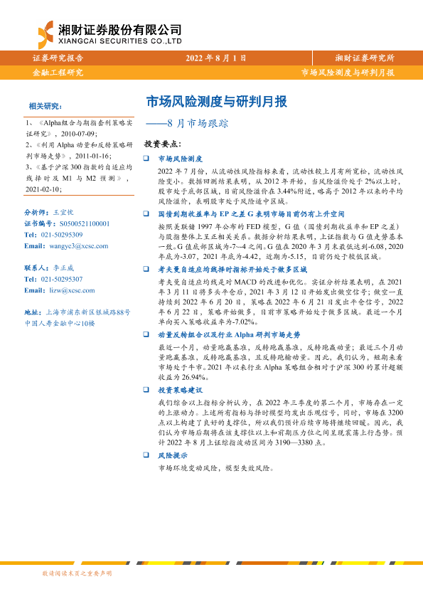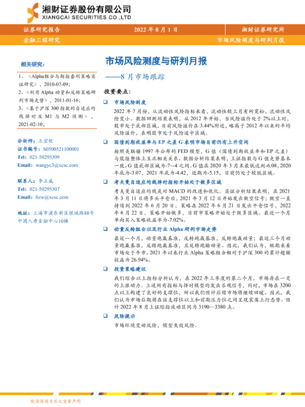 【湘财证券】【20220801】8月市场跟踪:市场风险测度与研判月报-15页
