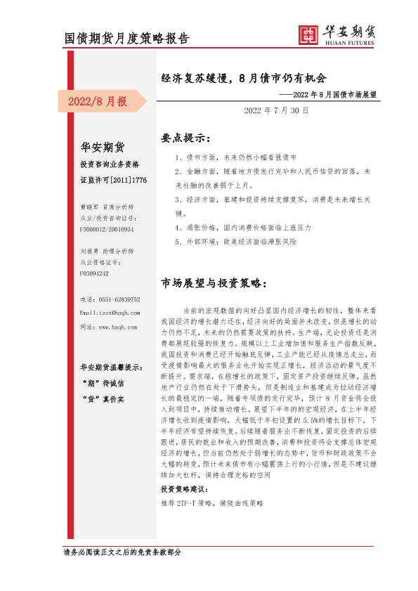 【华安期货】【20220730】2022年8月国债市场展望:经济复苏缓慢,8月债市仍有机会-17页