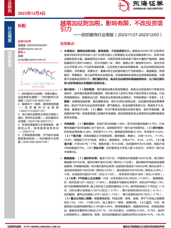 【东海证券】【20231204】20231204-东海证券-纺织服饰行业周报:越南加征附加税,影响有限,不改投资吸引力-12页