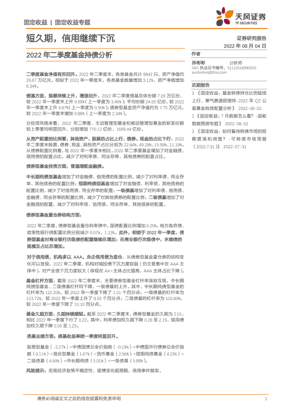【天风证券】【20220804】2022年二季度基金持债分析:短久期,信用继续下沉-15页