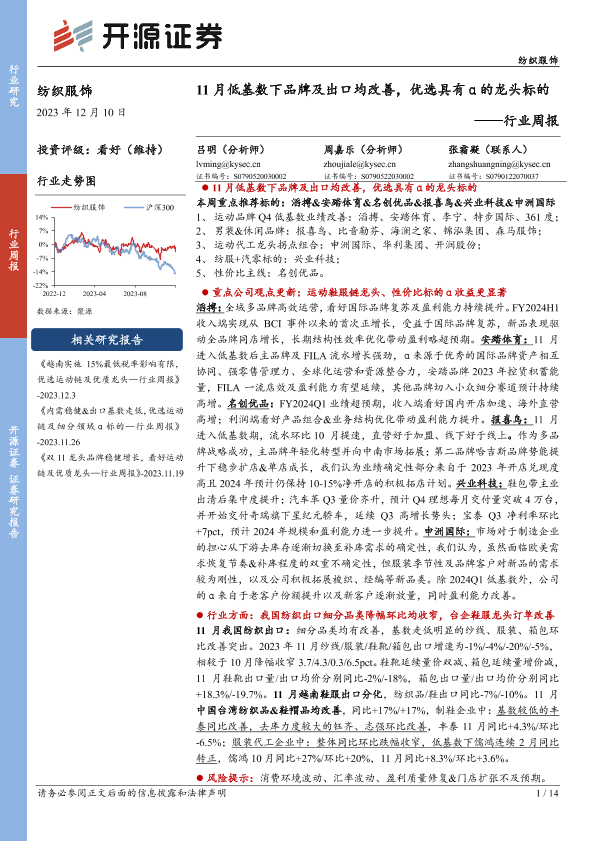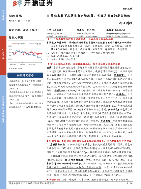 【开源证券】【20231210】20231210-开源证券-纺织服饰行业周报:11月低基数下品牌及出口均改善,优选具有α的龙头标的-14页