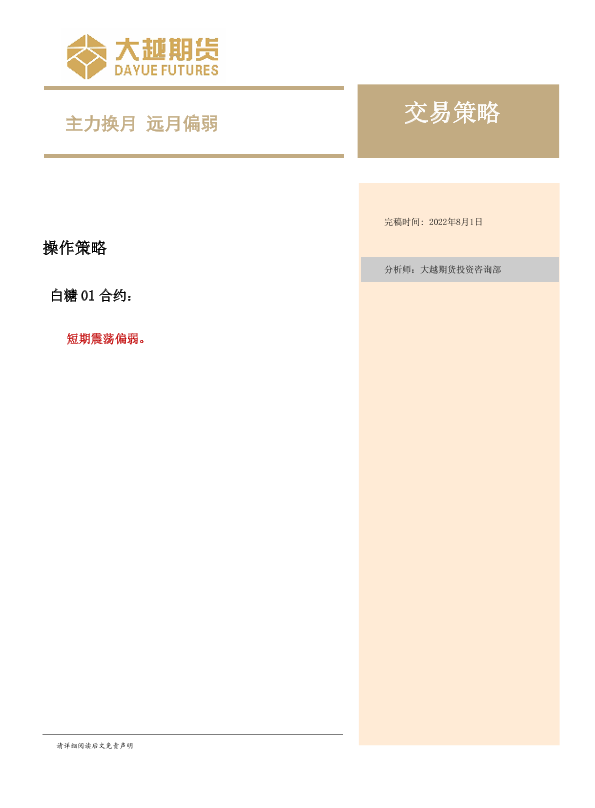 【大越期货】【20220801】白糖交易策略:主力换月,远月偏弱-15页