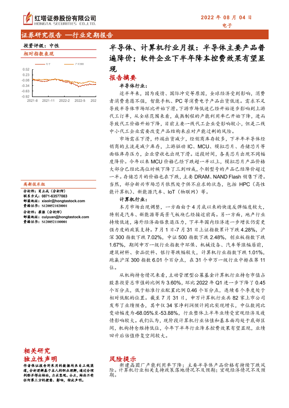 【红塔证券】【20220804】半导体、计算机行业月报:半导体主要产品普遍降价;软件企业下半年降本控费效果有望显现-18页