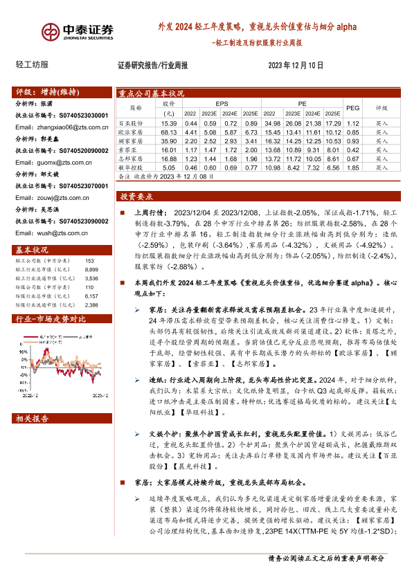 【中泰证券】【20231210】20231210-中泰证券-轻工制造及纺织服装行业周报:外发2024轻工年度策略,重视龙头价值重估与细分alpha-22页