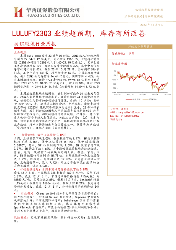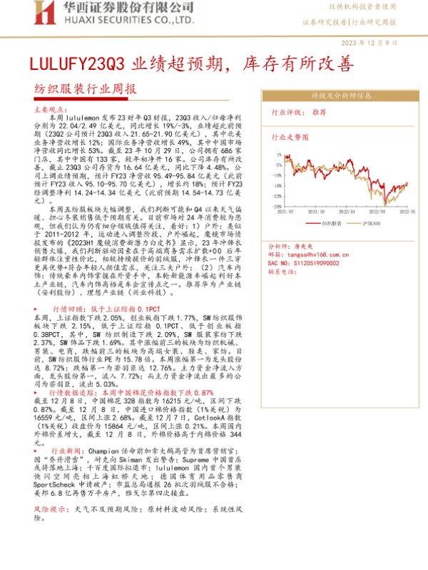 【华西证券】【20231209】20231209-华西证券-纺织服装行业周报:LULUFY23Q3业绩超预期,库存有所改善-30页