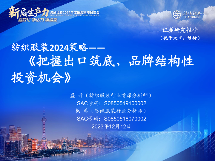 【海通证券】【20231212】纺织服装2024策略:把握出口筑底、品牌结构性投资机会-27页