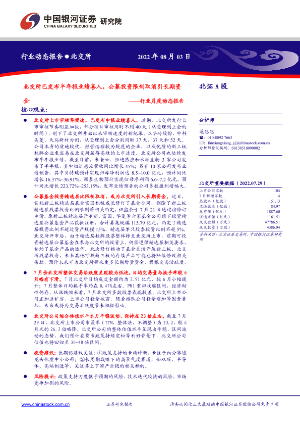 【银河证券】【20220803】北证A股行业月度动态报告:北交所已发布半年报业绩喜人,公募投资限制取消引长期资金-18页
